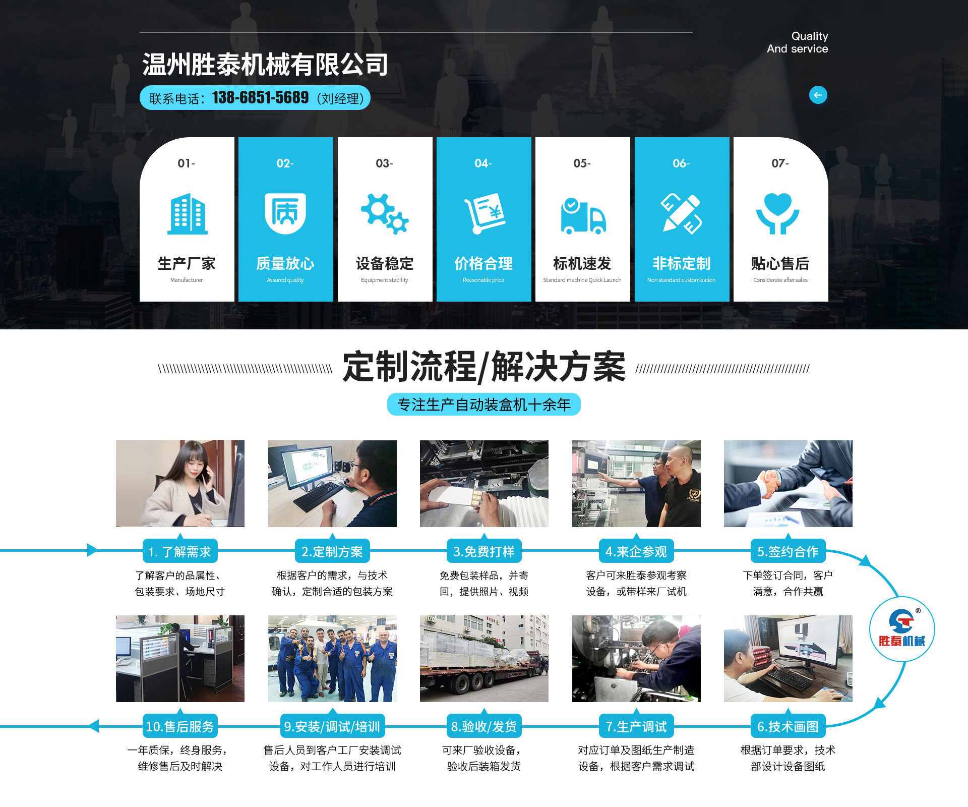溫州勝泰機械有限公司位于東海之濱, 坐落于"包裝機械城"-溫州市。集研發(fā)、生產、經(jīng)貿于一體的現(xiàn)代化科技型企業(yè),是國家高新技術企業(yè),通過了CE認證、IS09001質量體系認證,并獲得了多項專利。從事盒裝紙包裝設備10余年,具有先進的技術力量和生產工藝,制造經(jīng)驗豐富、產品質量可靠、價格合理、能為廣大客戶提供設備、技術、原材料供應全方位服務,幫助客戶打造專業(yè)化、智能化、無人化的工業(yè)4.0工廠。